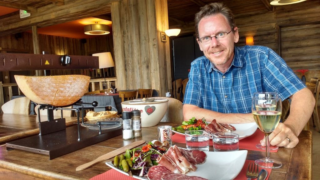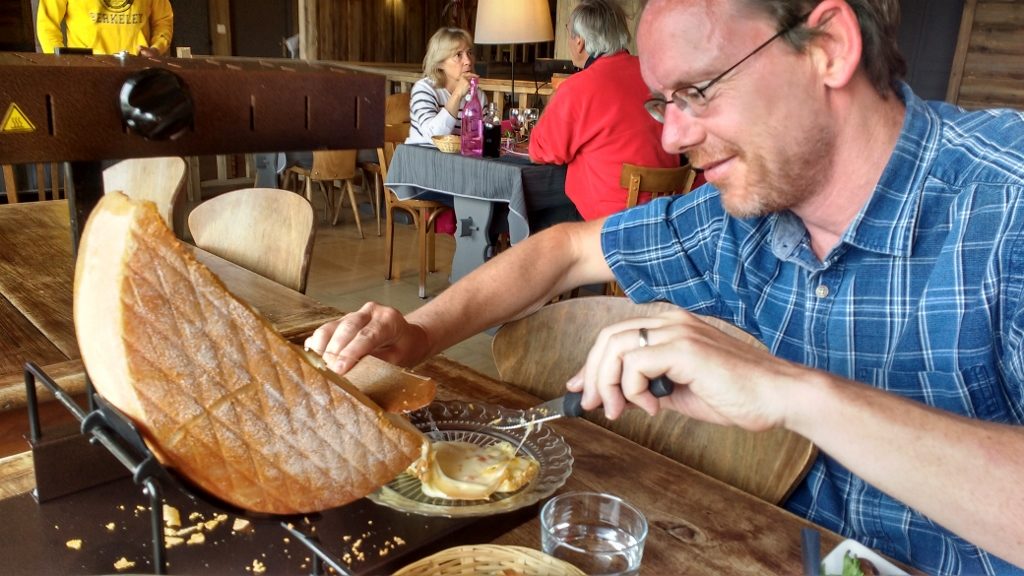 Picking up from the last blog post down the valley, we had that raclette and it was delicious! Toasted cheese, meats, pickles, bread, potatoes and a bottle of ice-cold local white wine went down a treat. It was a bit of a blow-out in terms of both calories and Euros, but well worth it! Having not used the cheese-melter device for a few years, we got a bit of training before being let loose, and managed to return what was left of the half wheel with it in reasonable-ish shape!