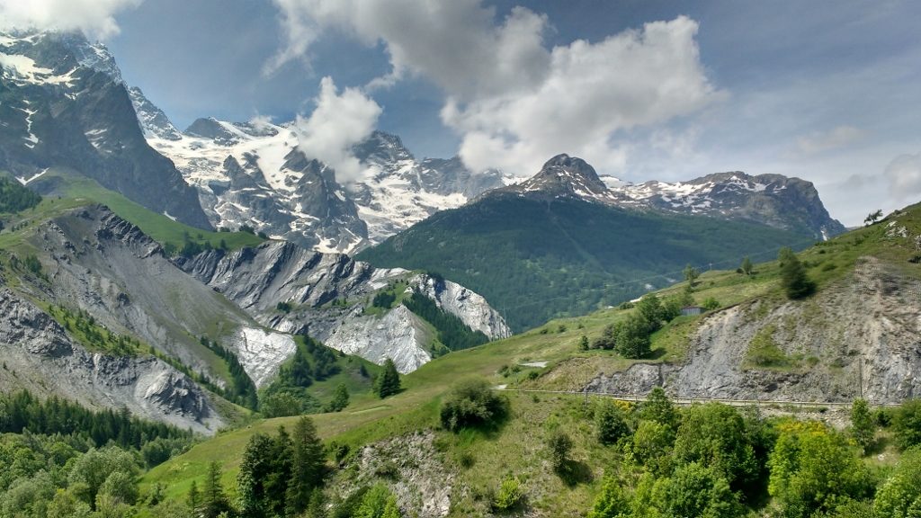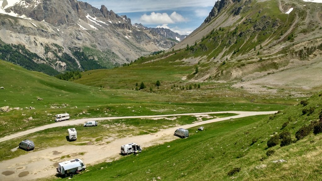 Zagan the motorhome’s surrounded by sheer rock and ice, a simply beautiful place, at the Col du Lautaret in the French Alps. We’re in a free, tolerated parking area set back from the main road with ten or fifteen other motorhomes (N45.03250, E6.40758). To the south of us stands the Parc National des Écrins, devoid of roads, a mass of rock and glaciers. A short walk (about 60 seconds) from the van we can see the glinting Glacier de la Meije, and to the north winds the almost-invisible Col du Galibier. This is a special place, very beautiful.