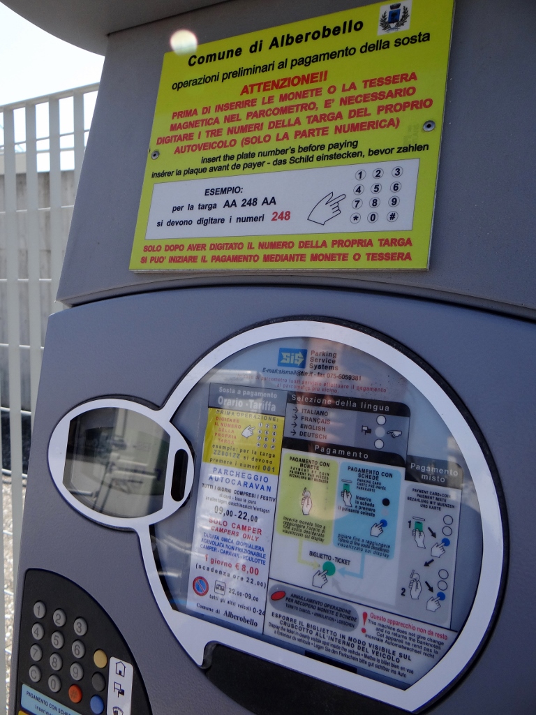 Alberobello was only a short drive away. We followed the motorhome parking signs and edged our way through the heavy traffic to a large car park with several Italian motorhomes in it. After ten minutes of deciphering the numerous signs about parking restrictions (we finally worked out this car park is motorhomes only, you pay from 9am – 10pm but it’s free overnight) I then spent another fifteen minutes trying to work out the ticket machine. It doesn’t help when it only takes coins and one of the most helpful signs they could have put up: ‘change machine around the corner’, isn’t there!