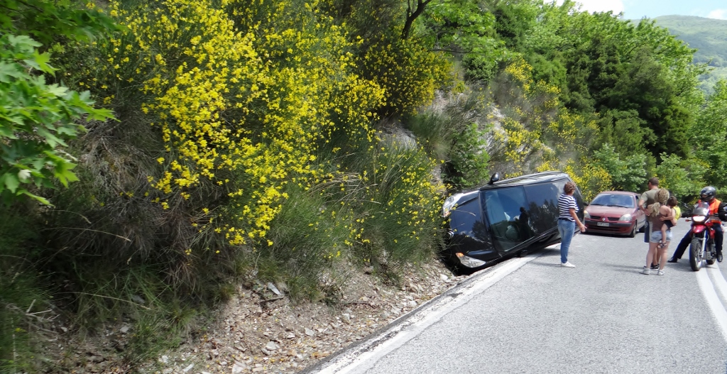 The woman nearest to the car was on her phone and lighting a cigarette, a common combination for Greek drivers – perhaps that is what caused the accident, or was it the boy racer man? Once we were sure that we couldn’t help any further, we headed off. It was only after we had gone that I realised that the woman next to the car was probably the driver, on the phone to get help and having a cigarette to calm her nerves. The man, who I had assumed was the boy racer/driver, must have been in the car behind with his young family. Lesson learned, never jump to assumptions Julie.