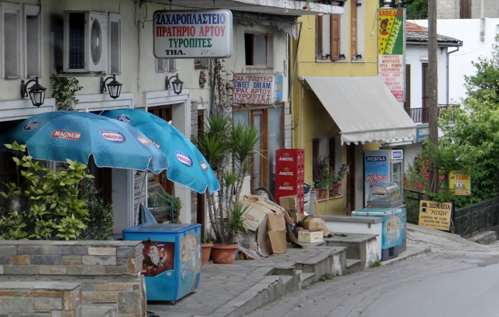 Main street in Zagora – luckily I can spot a cheese pie sign from a distance (the green lettering on the top sign!)