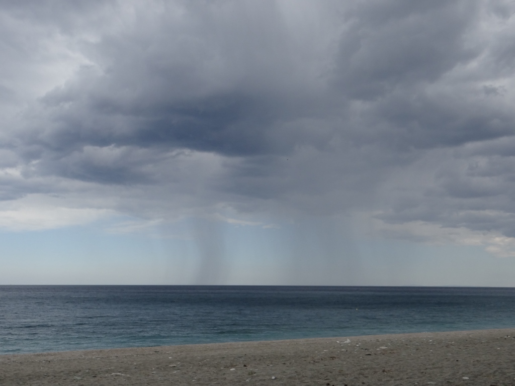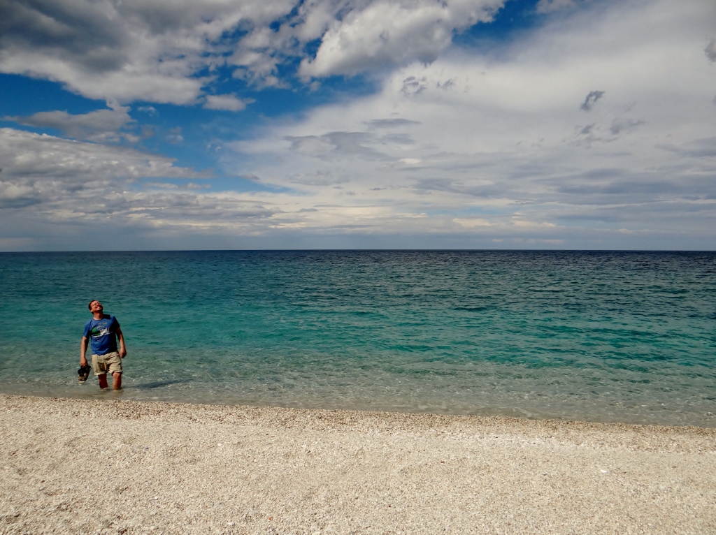 Another eight twisting kilometres brought us down from the cool of the mountains to Horefto, its wide sandy beach stretching out along the cove. Being a Sunday there were even a few folks on the beach, and if beach bat and ball ever became an Olympic sport I think the Greeks would win hands down. We parked up and went for a walk, the town is mainly rooms to let, restaurants and beach bars. As we got half way along it started to rain a little, I looked up at the forest of green trees on the slope above us and it was lashing it down there. This gave us just enough warning to take cover under the awning of a closed ice cream stall for the five minutes of rain. When it finished we decided to head back to Dave, the air around our feet got noticeably warmer as we walked and the coolness of the rain evaporated.