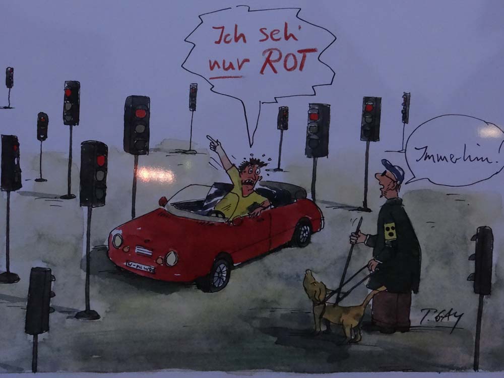 The town we were in yesterday was in organised chaos, as closure of a bypass tunnel had forced all traffic through the compact centre. A series of small billboards stood around the place, organised by the people managing the works, and urging patience in a slightly different way. The one below has the driver despairing: “I see only red!”. The blind man responds: “At least…”.