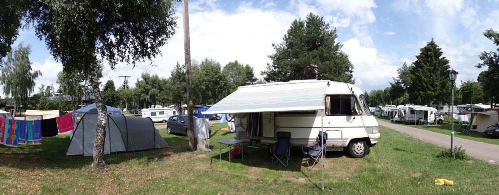 Another half hour later and we arrived at the campsite here, jumping out to say hello to Jacqui, Mike and Mike’s young daughter Millie. We last saw these guys in Greece, and since then they’ve rolled on up through Bulgaria, Romania, Hungary, Austria, Switzerland, France and finally into Germany. Their trip ends about the same time as ours, and we’ve enjoyed reminiscing with them, looking to the future, talking through minor misadventures, playing cards, swimming, eating and drinking. They told us how Millie flew over to Germany on her own (on an assisted flight), but the poor girl’s passport was left somewhere along the way and she had to have a temporary German one issued. No problem, it was sorted out and she’s been able to share a few days with them here. Tomorrow we head west, into France, with almost no plan but to head for the big hills, the Alps, and to get some planning done!