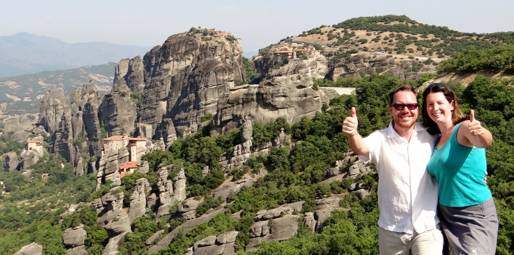 This morning we were up and gone by 9am, an unusually early start for us! We drove the short few kilometres up to the road overlooking Meteora and worked our way along the viewpoints overlooking the monasteries as the sun shone on them in the morning. Standing on a huge rock with this amazing vista it reminded us of why we are doing this (advanced apologies for the many, many photos below!).