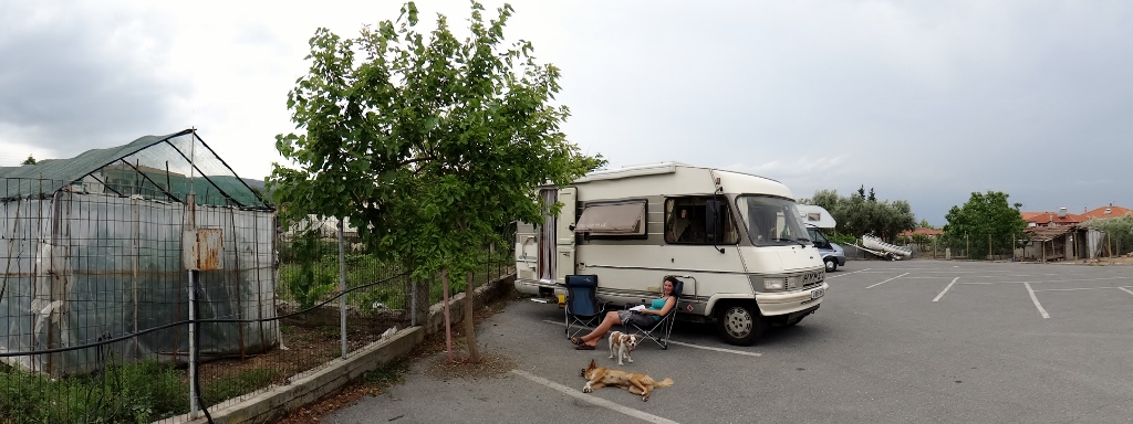 Arriving at the nearby village of Vergina we followed the signs around the town to find the motorhome parking where we were greeted by Thomas who showed us where everything was and explained what local attractions were open today (that’ll be none as it’s Monday – but we already knew that). The town is the home to some Royal tombs, which we’ll visit tomorrow. We got out camping chairs out and relaxed in the shade as we were both sweating.