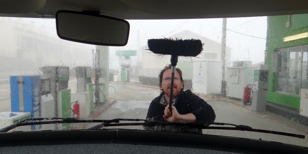 Back in Zagan we settled down to watch a movie, we’re still recovering from last night. Every time we moved Zagan would let out a grunt of indignation from his rear suspension. In our movie there was a huge storm at sea which sank a boat (no it wasn’t Titanic, but along those lines), between the roaring waves I could hear a grinding noise, turning to Jay I asked if it was on the movie then suddenly Zagan began to rock from side to side. Throwing the curtains back to see who was rocking him, the world outside was moving – we were rolling backwards. I leapt up grabbed the handbrake up to stop us, as I pulled on it we stopped with a crunch.