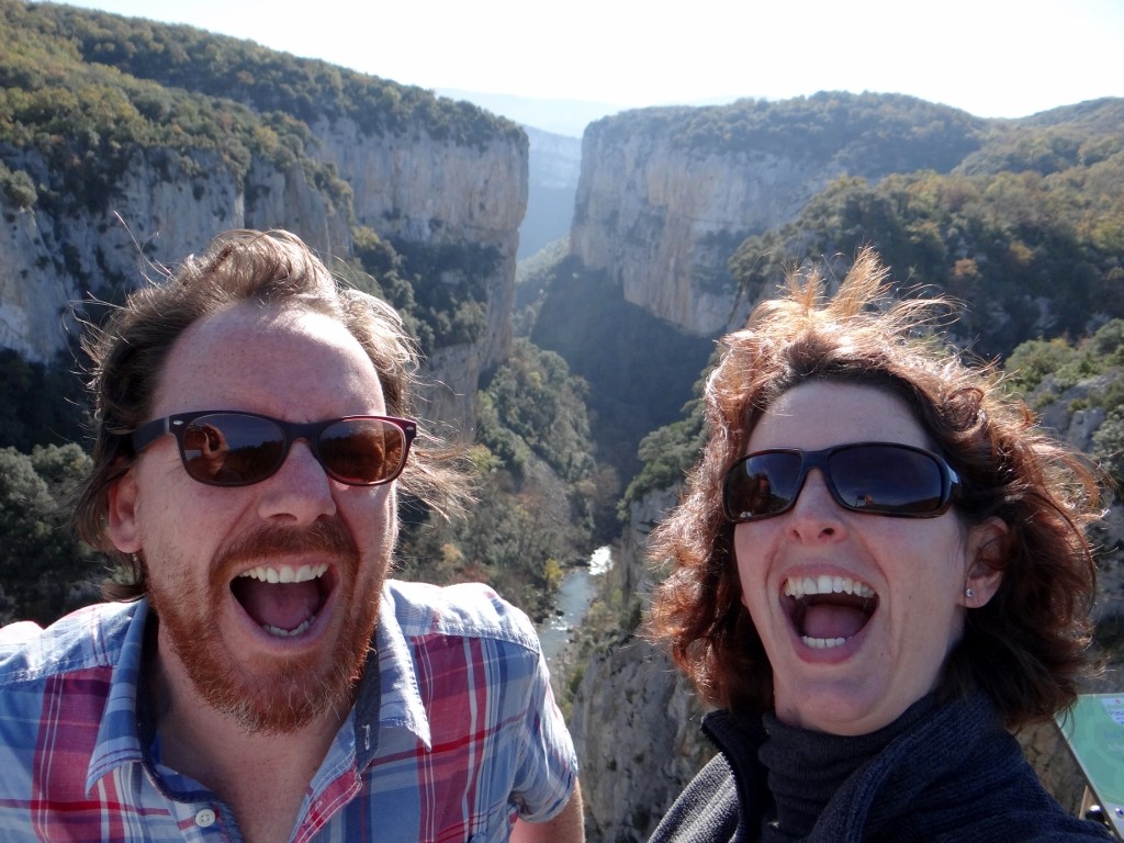 I stepped out and walked up onto the viewing platform while Jay gave Charlie a quick leg stretch. Our fearsome little pooch didn’t want to go anywhere near the viewing platform and I can totally understand why, it gave me the heebeegeebees when I first stepped on it. Once pooch was safely back in Zagan I guided Jay across to the edge of the platform with his eyes closed. When he opened them he could see why I was so excited – we were hovering above a river which had carved out a 100m deep gorge into the earth.