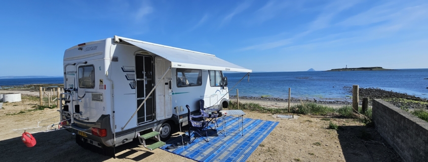 We’d tried to booked into Seal Shore Camping at Kildonan when we arrived on Arran a few days ago but they had no space. On a whim, we nipped in on foot and asked if they happened to have any pitches free. Tina in reception smiled, asked how long our motorhome was and pulled open a huge book full of writing. And I mean full! Incredibly they’d had a cancellation and we could have a sea-front pitch for a single night. We whipped out a credit card and speed-yomped back up the hill to fetch the van.