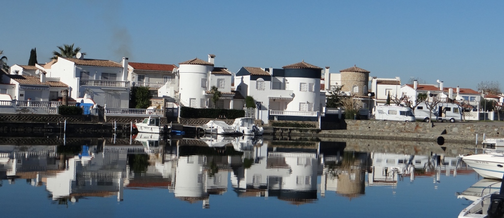 Empuriabrava is as old as I am – built on the location of a swamp in the late 60’s, early 70’s. Tourism in Spain must have been one serious Golden Child when the developers suggested the place. It’s a massive complex of villas, most of which front onto part of the 15 mile canal network, providing 5000 private moorings, and must have cost the Earth to create. Nowadays it’s got a population of about 8,000 in winter, rising to 80,000 in the heat of summer. We’re here in late November, and it’s pretty much empty.