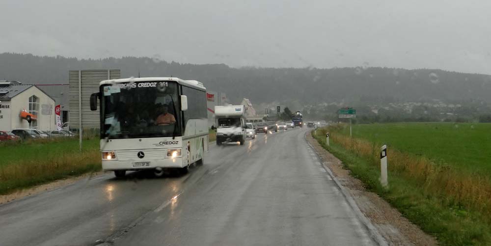 What little motorway there was had gone and now it was long twisting roads through small towns and villages. A couple of hours later Jay admitted that he was done in, so I looked for a nearby Aire only to find there were none, we seemed to be in a black hole of Aires. Normally in France they are in pretty much every small town and even some villages, but there was nothing for at least half an hour, so with that as our only option, I stabbed in the co-ordinates for the car park in Pontarlier. Almost as soon as I’d turned satnav back towards Jay we flew past a yellow sign which said something about Pontarlier, then we passed another one the same – the road 16 kilometres ahead was closed, so we needed to follow the deviation. Grrrr!
