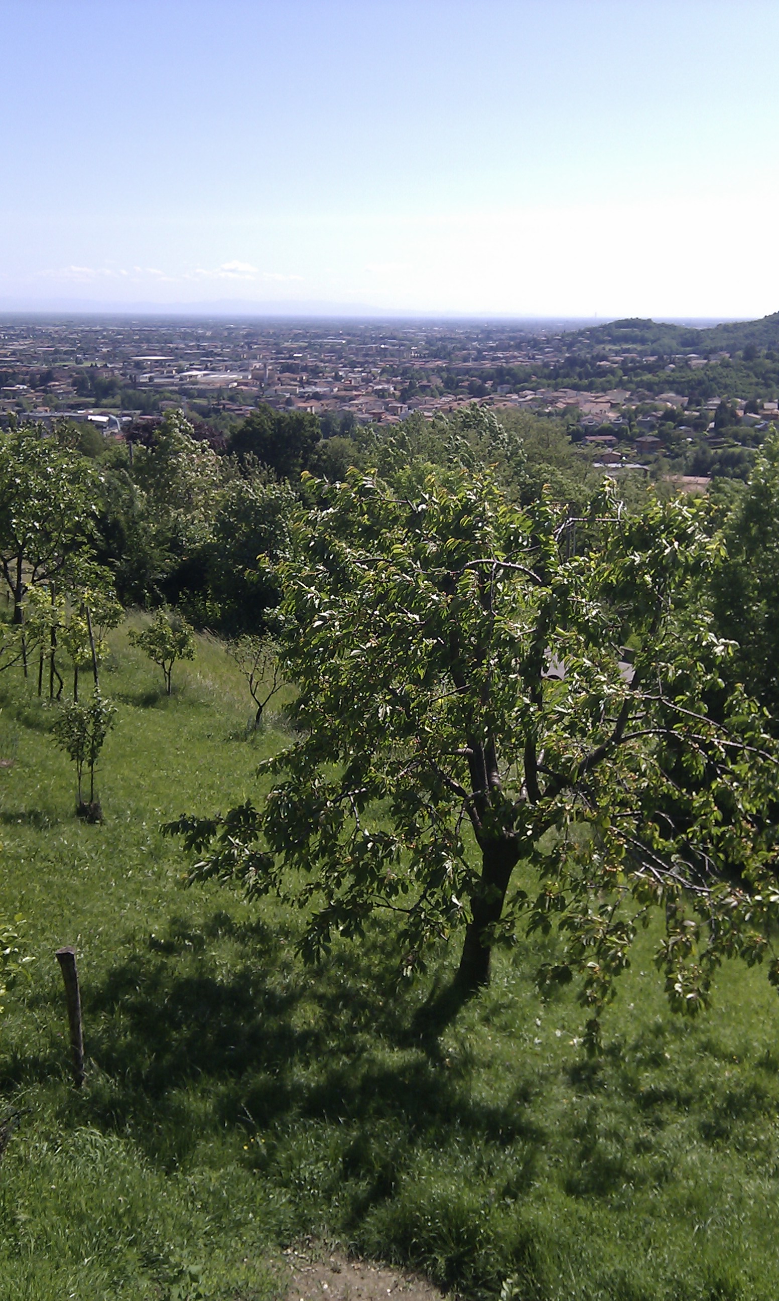 We’ve headed here as it’s (a) in the general direction of Venice and (b) it is shown as a free aire on our database. We’re so tired we skipped Bergamo, the nearest town, although we’ll probably check it out tomorrow. While Ju had a kip, Charlie (reluctantly) and I took a walk up the hill behind us. From there the green foothills of the Alps rise to the right, and a huge plain heavily dotted with houses and businesses flows out to the left.