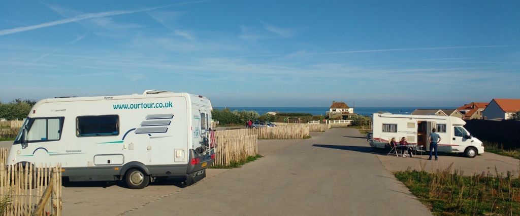 Back in Sangatte and satnav is still insistent we turn around, so I call on maps.me for help. It promptly tells us to turn around too, but undeterred we plough on. The reason for all the confusion becomes clear when we reach the entrance of the parking area. It’s so new it’s not on any maps yet. The entrance is off the D940 though, so if you just follow that you’ll be fine. There’s a large car park with height barriers, a place for buses (which the open-topped bus has used several times today) and an area to the left (if you’ve the sea behind you) with no restrictions, so it’s been decreed that it’s for motorhomes! We creep into the motorhome area as quietly as our diesel engine will allow, park on a bit of a wonk and fall into bed for a good night’s sleep.