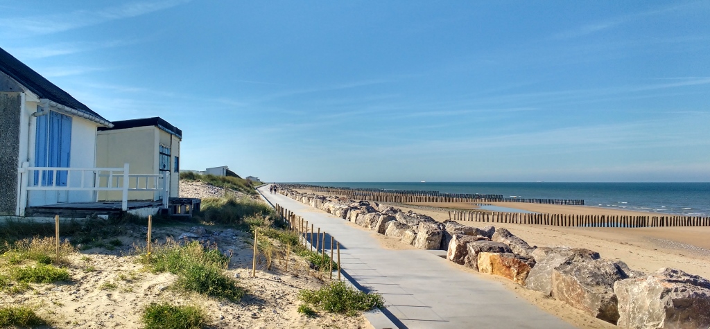 Now I don’t know about you, but whenever I hear the name Sangatte, I think of migrant camps, in fact I thought the ‘jungle’ was here until Jay pointed out we’d driven past that several times at Calais. What the name is synonymous with is a Red Cross migrant camp which was opened in 1999 in a huge hanger previously used for storage while the Channel Tunnel was being built. The camp was opened to provide shelter and food for the hundreds of migrants who were sleeping rough in the area. In 2002 under pressure from the UK Government the camp was closed and the building pulled down. There’s no sign of it now, just a little French seaside village with a new boardwalk along the sea front overlooked by a mixture of posh new homes and tiny worn-out beach huts.