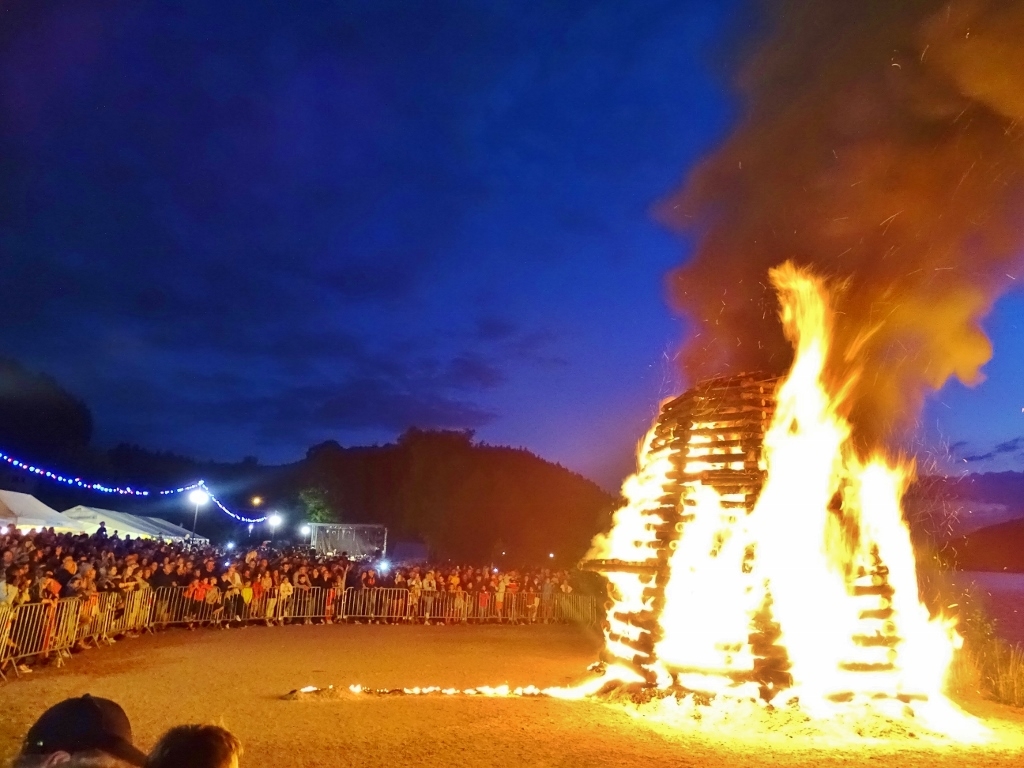 A couple of hours after it started there was a sprint finish for the men between four riders. Not knowing who any of them were, we slipped away before any award ceremony and headed to the lake. After a bit of language confusion, we grabbed hot dog and chips (it was a full on food blow out day) from the stall run by the local council and sat on the grass as the sun set. As it grew dark, the sounds from the pop concert (think cover versions of Uptown Funk etc) went quiet. Everyone stood up as a brass band led a procession of fire fighters with flaming lanterns, followed by children with paper lanterns (hopefully lit by LEDs!), from the town to the bonfire.