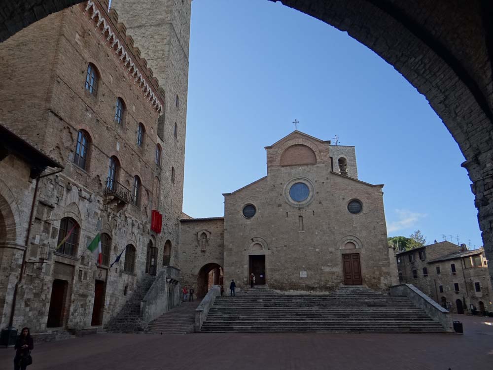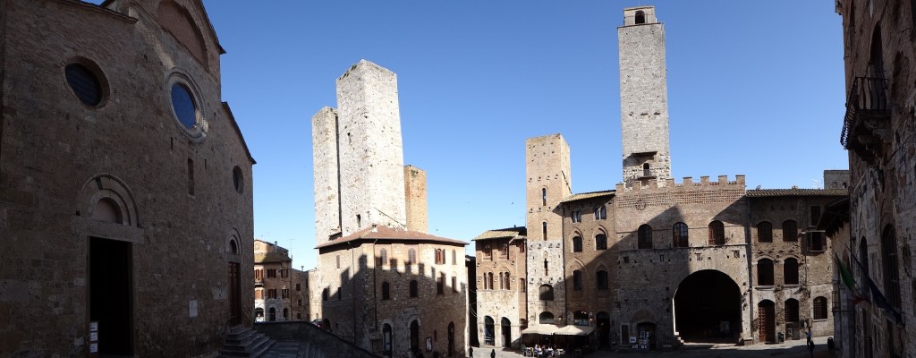 The small bus running past us would, for €1 each, carry us the mile into the town and back again. I wonder how it makes money, since walking in the sun, along a ridge punctuated by renovated farm houses and looking up at the town’s tall towers easily drew us away from the stop. That’s something else unusual: towers were a thing of power in these old towns, handy for both keeping an eye out, and poking at the sky a finder of authority in a highly fragmented ‘hate your neighbour’ Italy, but building 70 of them was perhaps a bit much? In a San Gimignano of old, when they weren’t rucking with the next town, they were rucking with each other, factions building taller and taller towers to demonstrate their virility or some such. Most are gone now. Depending on which source you believe, or how good you are at counting once you’ve run out of fingers, there are somewhere between 12 and 15 left.