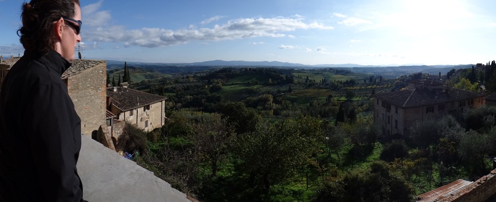 San Gimignano had an immediate impact on us yesterday. Our trip’s taken us to a fair few well-preserved medieval towns, but none have been quite like this one, this one feels alive. A few thousand people still live inside, balancing off its pack of stalking tourist shops (unreal, overpriced, but always tasteful) with washing flapping high on draw-string lines, tiny cars squeezing into garages, a passenger shouting thanks and hauling off a six pack of mineral water, and signs in Italian requesting aid for compatriots shaken by an earthquake. It’s the first of these ancient towns I’ve wanted to visit twice.