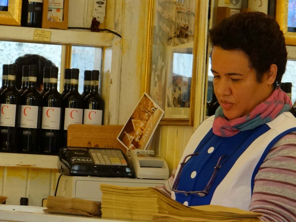 The walk passed in minutes, even with a muddy detour into a vineyard looking for a shot of the town sans-power lines. In through a stone door, the view of the main street again thumped me. This place is unfathomably old. The Etruscans, fore-runners to the Romans, kicked off the settlement over 2200 years ago, but the current incarnation, a jumble of crumbling masonry, arches and anarchic red mouldy roof tiles dates from around the 13th and 14th centuries. It’s extraordinary to think that half the population, killed by the Black Death 650 years ago, might still recognise the layout of the streets, maybe their own homes if they were to walk here again.