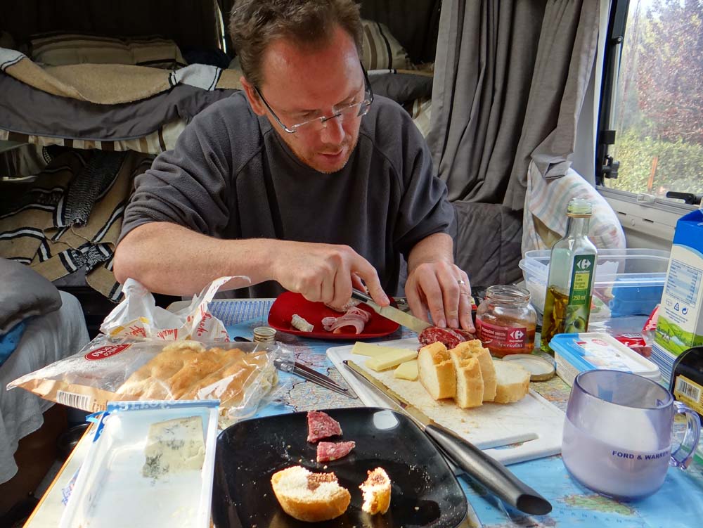 Now that the aged couple with the ladders have given up harvesting olives around the corner, carrying their ladders and nets away, we’re left with half-hourly passings from the local bus (devoid of passengers) for company. He finishes his rounds at 8pm, and the place then turns deathly quiet. We thought we may have company when a Polish motorhome pulled alongside, but they were just using the service point next to us, and foraging for an unknown leaf in the bushes, maybe Bay Leaf, we can’t tell, sadly.