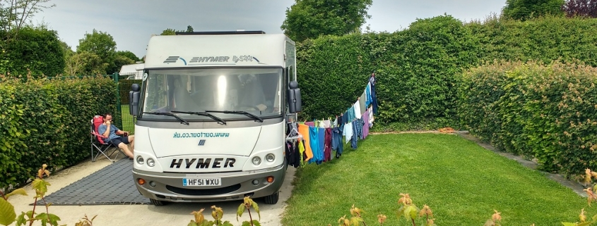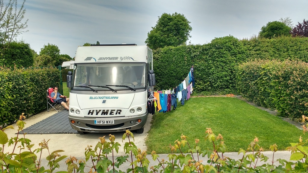 Out came the database again and up bloomed the spot we’ve been glued to for the past couple of days, and likely a day or two more. We’re at an aire in Neufchâtel-en-Bray, all of about 5 minutes from our last stop and a convenient distance from one of the main free fast roads north-south to the east of Paris (N49.73685, E1.42905). The term ‘aire’ is a bit of a catch all for everything from a sloping car park alongside the local train line all the way up to, well, this kind of spot. We’re in what I’d call a ‘motorhome campsite’, designed specifically for campervans and motorhomes who don’t want the full services of a campsite, but like having a hedged pitch with a grassy and gravel areas to sit in, dry the laundry (€5 a go on the washing machine and there’s a dryer too), cook al fresco, feed the ducks, read, sup your favourite tipple and comment, again, on how sunny it is. The aire’s co-owned by a full campsite next door, and costs €12 for 24 hours, including services and access to a unisex loo (feels weird using the urinals when ladies walk in) plus a shower, the latter costs a bit extra so we’ve just used our own. A chap on a sit-on lawnmower manicures the place each morning.