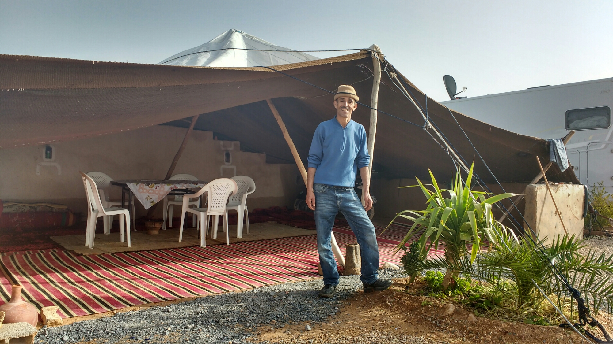 Zagan the motorhome’s occupants have been elevated to the status of roi et reine! This is how the owner of Camping Tinnougba in Bouizakarne described us just now – all of his guests on the small, family-run site are treated as kings and queens. He seems a gentle man, but strong with it, and reminds me of my father. He’s utterly authentic, touchingly so in his welcome, and I’m quite a cynic in these things.