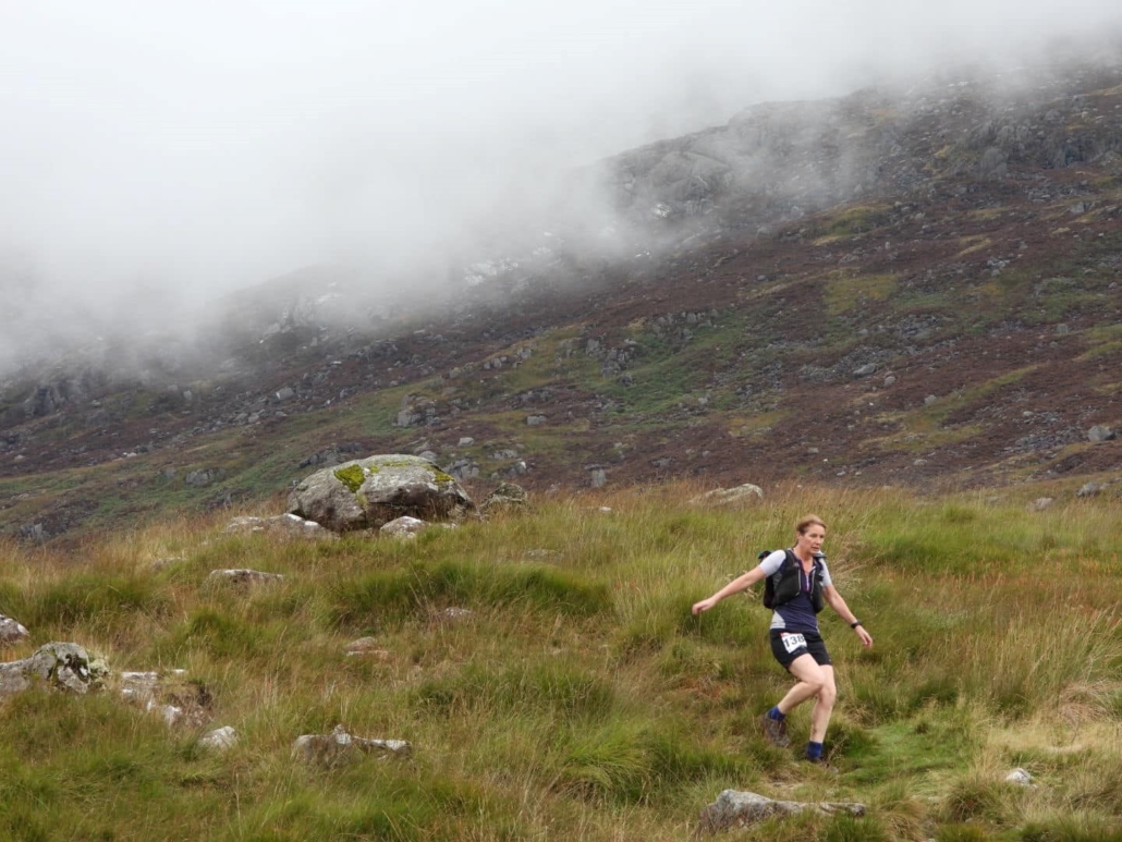 It didn’t work out that way for us though. Low-level cloud over the peaks had the race organisers concerned and as the race progressed we kept being told more and more of the high level route was being swapped to low-level ones. This meant we ‘only’ had to go up Snowdon and the rest was done on relatively low altitude trails. We went from needing to run/hike 50+ miles to 46 miles, and instead of doing 3,600m of climbing, only needed to do 3,000m (about 10,000 feet). I can’t say I was disappointed! The descents were worse for me than going up. I’ve practiced running on mountain trails in Spain, Snowdonia and Cumbria, but to be honest I’ve avoided the long, steep slopes covered in awkward wet, slippery rock which feature heavily on this course, out of fear.
