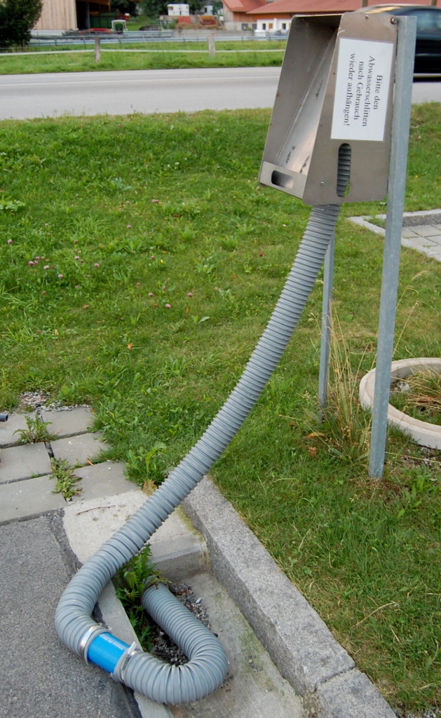 We love this, instead of trying to reverse Dave over a grate to empty his water tank, you position the square box under the pipe to catch the water – genius!