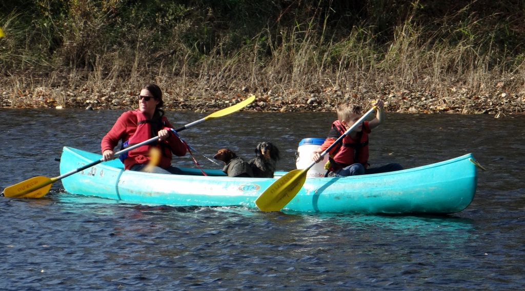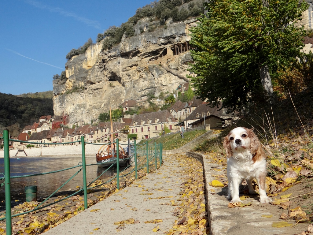 I used to sit on the bench behind Dad so could I look over his shoulder at where we were going, but now I’m getting on a bit I can’t jump up and down off the bench on my own, so I stay on the floor where I can get to my water on longer runs. We stopped after about 15 minutes of driving today though, and I got out to have a look around. We were in La Roque Gageac (or Roughough-Snuffle-Rouff in dog-tongue) and it was really pretty, yellow brick houses lining the river with caves in the cliff face above. It was very, very windy – those big leaves really hurt when they hit you – I had to stifle a laugh as one hit Dad in the face, the bog oaf! After a quick wander along the river we headed off again – after a gravy bone.