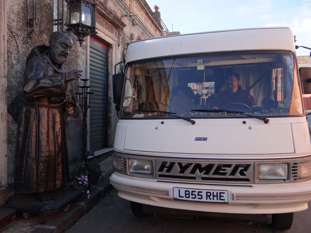 Driving around the block in Sicily should be designated a form of trial-by-torture under a human rights act or other. On the second turn the road predictably narrowed to the point the right wing mirror hang pinged off a drainpipe and was now merrily scraping along the wall. Dave’s left side was within inches of a car. Cue horn honking from behind. I joined in, maybe I am going native? As Ju jumped out to see if we could get through (the answer was no), a local chap joined in to help, and through the left window I could see a waiter donning rubber gloves and gesticulating at me. The honking stopped once it became obvious we were wedged in tight. The waiter was, with massive relief, the car owner and jumped in to shift it. That’s driving a motorhome in Sicily for you!