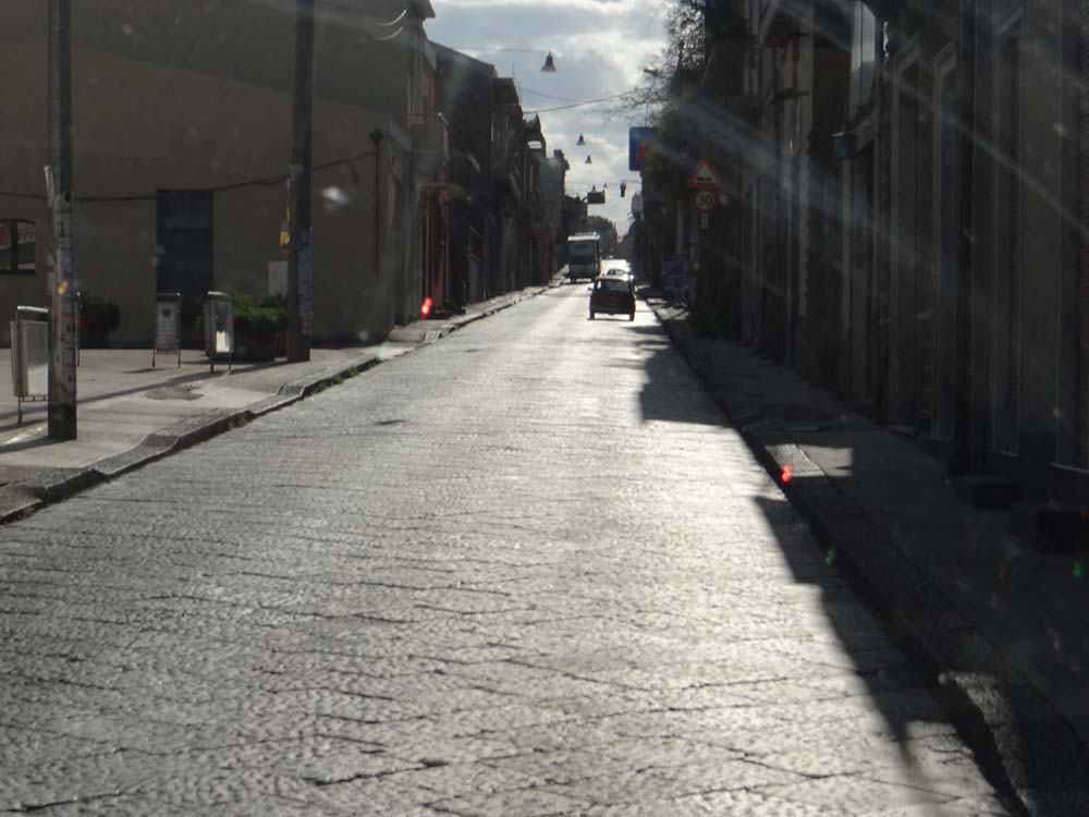 This morning, the sun beamed. So much so it melted all the snow robbing me of the chance to photograph it, and make us out as some kind of Ranulph Fiennes hard-nut expedition. Once we’d had chance to fashion a makeshift hinge from the metal wire sheet we bought in France an age ago, we plotted in a parking place in Zafferana Etnea and crunched off the black crushed lava car park.