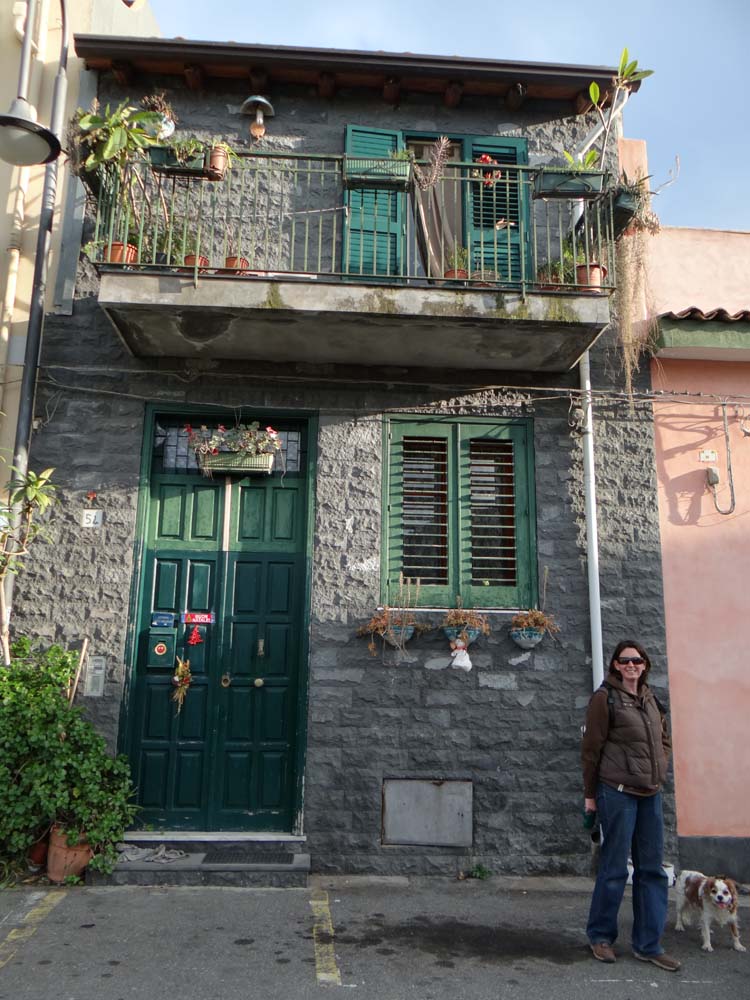 At this point, fate intervened. In the small town of Santa Venerina, as our SatNav grinned manically at the lava-stone leaning inwards, funnel-shaped streets she was directing us down, we spotted Padre Pio. He pops up everywhere. The first time we came across him was on Vesuvius. This time he was fashioned in metal, a man-sized sculpture stood outside a workshop. Ping! A lightbulb. Maybe he can make the door hinge? With a bit of driving up the wrong way up a one way street (Ju say’s I’m going native) we parked up fifty meters or so away.