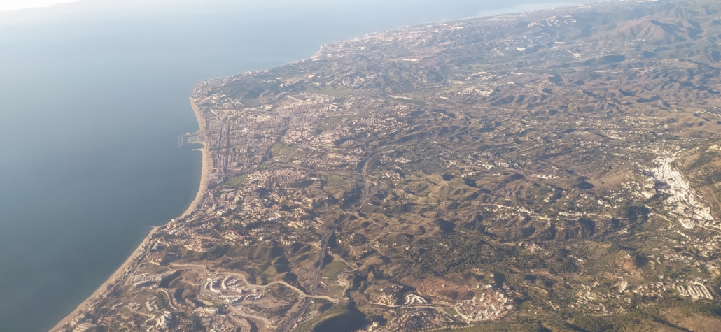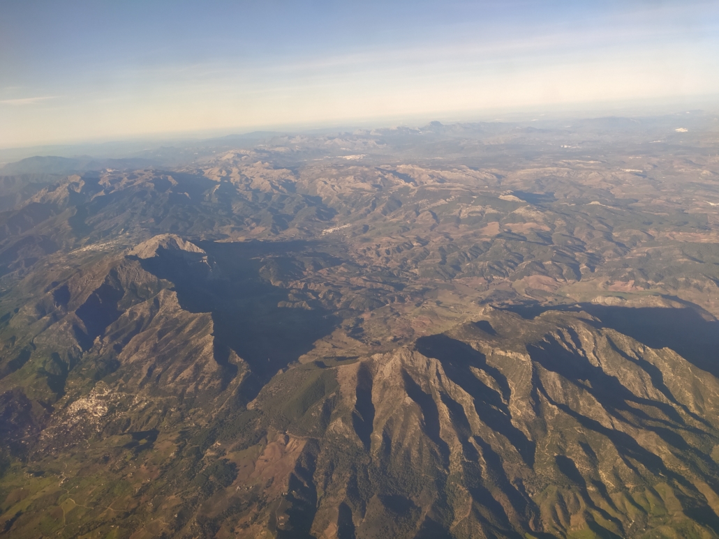 Eventually, as we flew over Cordoba, the cloud gave way and we’d beautiful views of the rugged Andalucian hills and mountains below, tiny villas and lorries just visible, the sun bright on endless dots of olive trees. The plane headed out to sea over Malaga, turning back inland to approach the runway and giving us great views over to the Sierra Nevada, snow-capped and, we’ve since read, the ski resort up there is open for business.