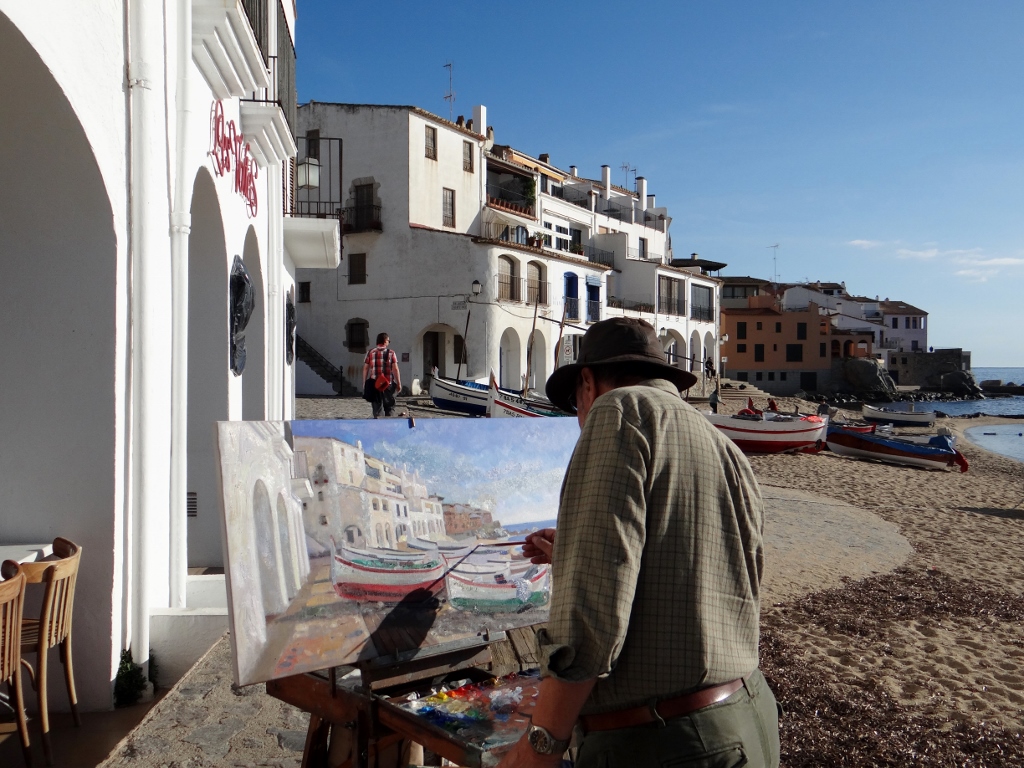We followed the road to Calella, the resort to the south of Llafranc, then walked the coastal footpath back to Llafranc. The small harbour had a few signs of life; people enjoying the sunshine on their balconies, wet-suited folks heading off spear-fishing, couples eating breakfast in a beachside café and one chap capturing it all on canvas.