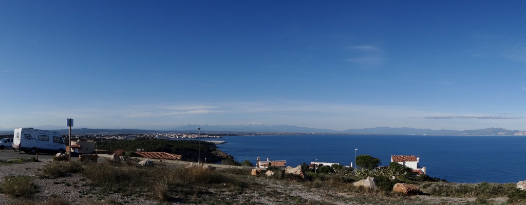 Zagan the motorhome feels like he’s on top of the world. He’s perched on the Punta Montgo (N42.11083, E3.17231) above the town of L’Escala with an ever-changing, breath-taking panoramic view over the Bay of Roses.