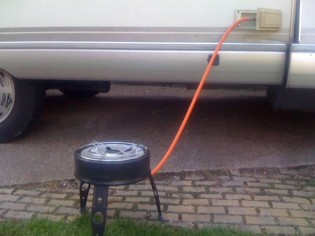 I got mine, funnily enough, from Kimberley Caravans. Not having an external gas point on our (very old) van, I have to use one of my propane bottles, but I use a hand tighten connector. Like you I only got 1m of hose, which isn’t too bad but I might invest in longer soon. The BBQ was fairly cheap, on off at the time, but then I paid £30 for a table to stand it on! Foolish as I now have a similar table that only cost me £10 and is a better height. This is because I find the BBQ on its own a bit close to the floor. Other than that, it is a great piece of kit. I would not recommend the pizza plate; I used the one I bought once, dropped it and, being made of stone, it smashed.