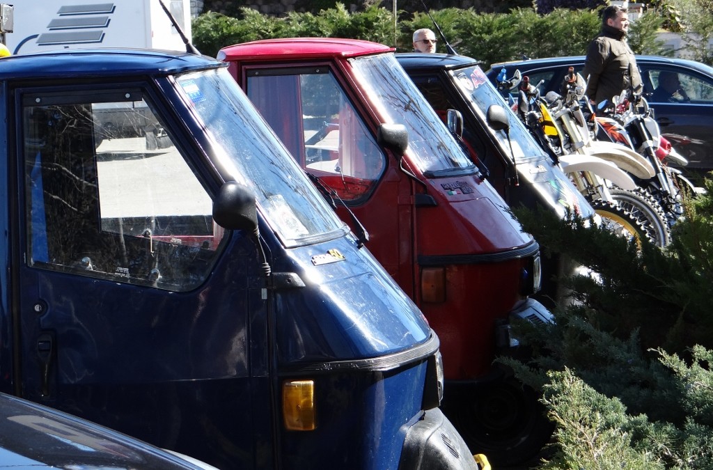 Out of La Morra, a 20 minute amble brought us here, the grand-sounding but tiny Grinzane Cavour. Oh, by the way, there are average speed cameras everywhere around these hills. Little blue boxes, some of the wee towns have two sets in both directions, clearly serious about slowing folks down. Pulling into the sosta here, I was stoked (man) by the sight of four Piaggio Apes in the car park. 50cc puppies, parked alongside similar-engined bikes. A wee while later the school kicked out, 16 year olds, style icons everyone, half of them lit up a cigarette within a meter of the school gate. A minute later a teacher strode out, dropped some books in his car, flicked a ciggy out, lit it and went to join the kids. I imagine this same action in the UK might see him sacked?