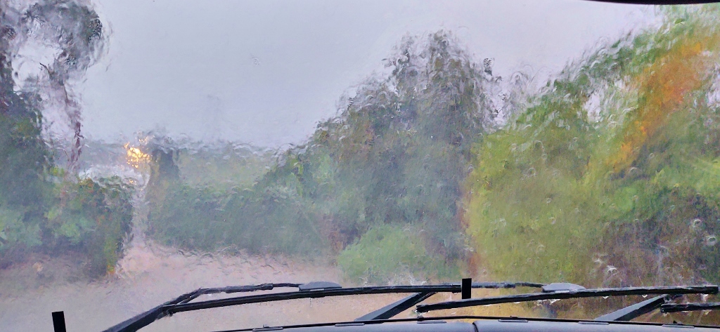 On Wednesday the weather turned, and overnight we had a cracking thunderstorm. I was woken around 1am Zagan’s interior lighting up with the lightning, but it was hard to hear the thunder over the noise of the rain on the roof. On Thursday morning we had to shout at each other to be heard, and in Zagan we’re never more than a metre apart.