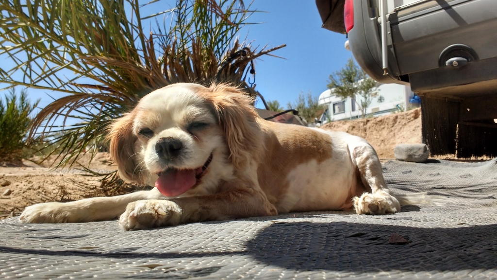 Zagan the motorhome's shading me from the desert sun. It's 33…