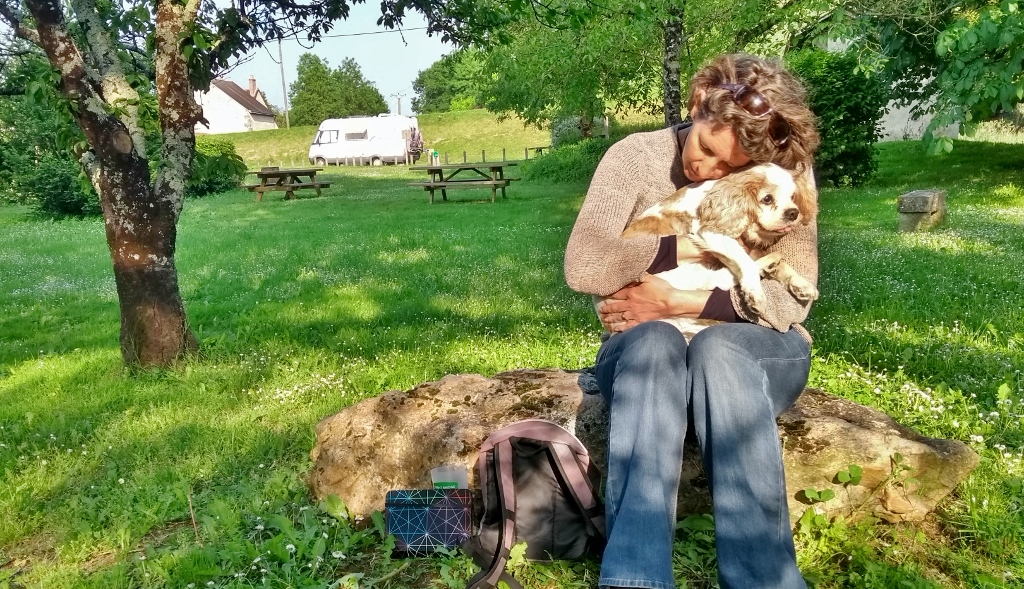 Back in Loches, we realised that going to look around towns and cities isn’t happening while it’s warm. Charlie’s heart medication makes him struggle in any temperature above 22°C. We have tried taking it in turns to stay with him in shade near the van while the other explores, but it’s just not working as he likes the pack to stay together. So we have come up with another plan, which is probably Plan C. Plan A was Croatia, which was scuppered as soon as we realised Charlie’s increased aversion to warmth. Plan B was pootling around France sightseeing. Instead of finding places and things to go and see, we’re making Plan C ‘Charlie time’, and going places that are good for him instead. This has meant that for the past few nights, we’ve been in aires in tiny villages with very little happening, but lots of shade and grass for him to amble about on.