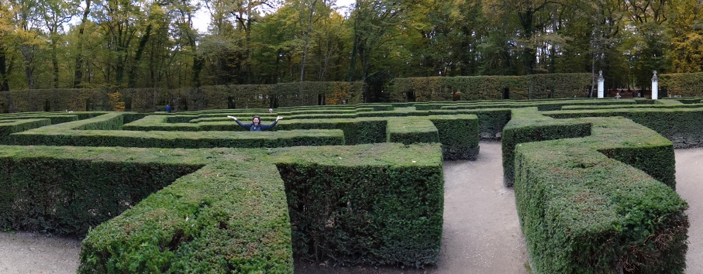 Coughing up €12.50 each we swapped our tickets for a little guide book which explained all about the chateau and what we’d find in each room, first things first though – there was a maze to do.