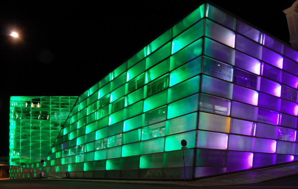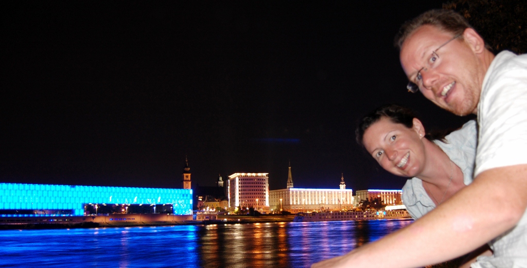 Not to be outdone, on our side of the Danube the Ars Electronica Centre was equally lit, changed colour and shimmered (you can see it on the video Jay took and posted on yesterdays update). We sat with all the young locals on a huge set of steps which face the building, they drank, we used the free wifi to upload the video. As we walked back to Dave around 11.30, the air was still warm and the sight of a police car driving around the car park made us feel safe – we both slept really well.