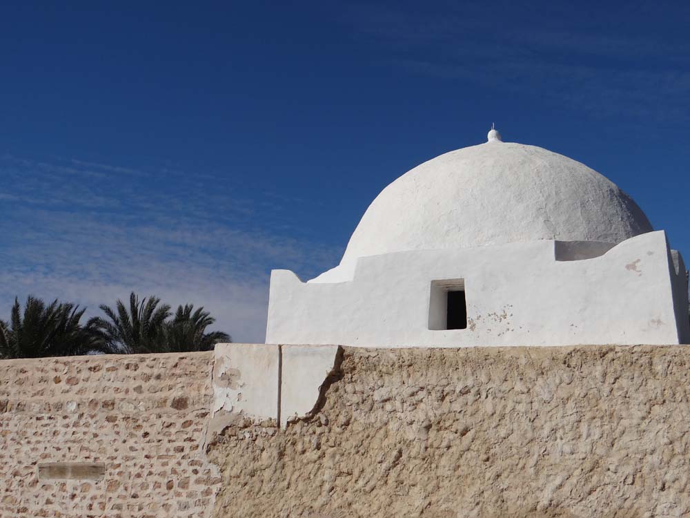 Turning south out of the camp’s tall blue steel doors, we took the main road for about 100 meters and turned off it, onto a sealed but bouncy single track through the palms, their leaves scratching at Dave’s roof and sides like rigid fingers. Edging in and out to let locals pass with hand carts, donkeys and even a green chugging tractor, we popped out from the thick trees into an opening, Old Kebili, the deserted and crumbling former town. With palms pressing in from all sides, this was the site of a former slave market, folks kidnapped from the other side of the Sahara would be force marched here, any falling by the way simply left to die. Our wanderings around the silent narrow alleyways, all stone walls, fibrous palm-wood lintels and whitewashed old dome-topped marabous, unveiled a couple of shops. Through a tunnel-like entryway to the old slave square we heard the rough barks of dogs, echoed by rough barks of locals to shut them up. Faced with a choice of fending off tat sellers and wild dogs, or turning on our heels, we bottled it.