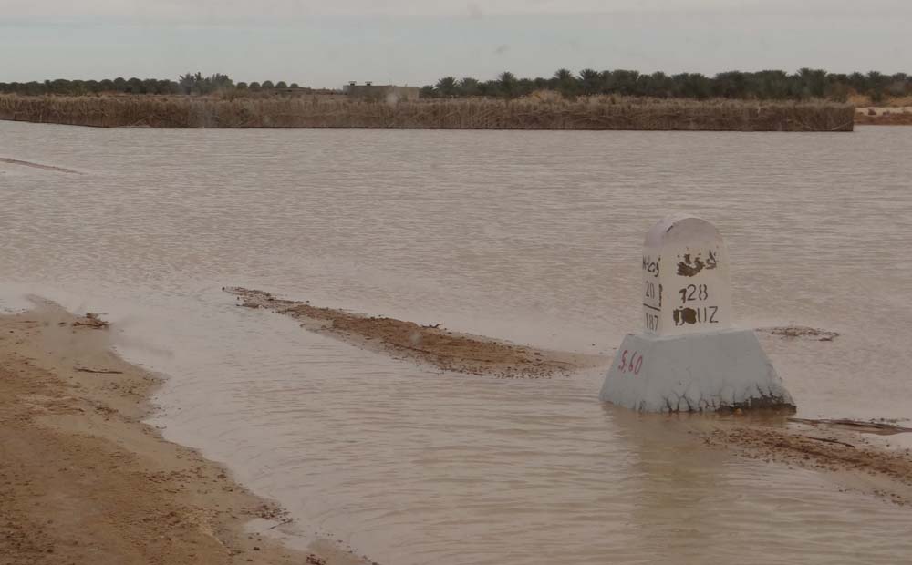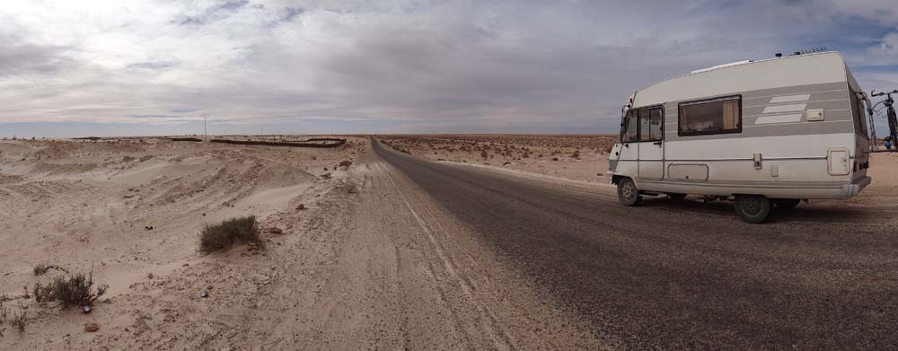 From the Pompeii-like ruins we took the white road south. Although we planned to come here, the direct yellow road (which pips a white road, usually by having a faded white line up the middle) looked too easy. Our route showed us swinging around in a wide circle, crossing the Chott Kebili, skirting the Chott El Jerid and Chott El Franig. I know what you’re thinking, that’s a lotto Chott! Indeed it was a lotto Chott, especially as Chott is basically Tunisian for ‘dried up nothingness’. Along we bounced, the road rumbling prompting an automatic reach for the volume nob on the stereo. Ju also reaches for said control whenever I start crooning ‘midnight at the oasis’, relacing the word ‘midnight’ with whatever takes my fancy. I don’t blame her, especially as those are the only four words I know.