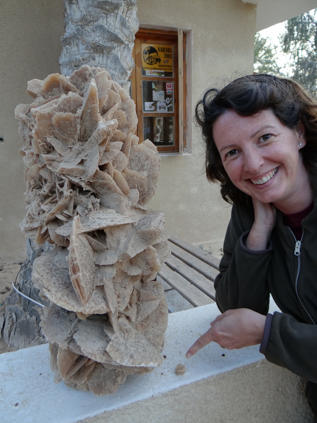 So, in recap, today has basically consisted of (a) escaping from Arafat’s hospitality (b) thundering along car-wide sand-lined roads, pulling over to let light-flashing oncoming locals to get past (c) finding a a few tiny desert roses – gypsum and sand crystals formed by water evaporating from between dunes and (d) finding this French run lovely little site and cursing the total lack of Orange signal. There’s an Internet Cafe around the corner, if you’re reading this then we found it!