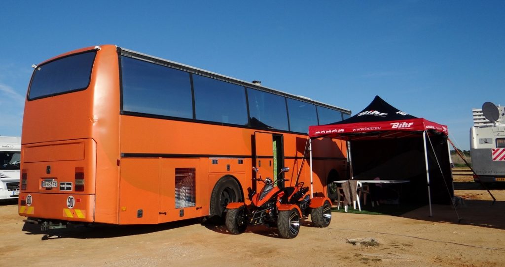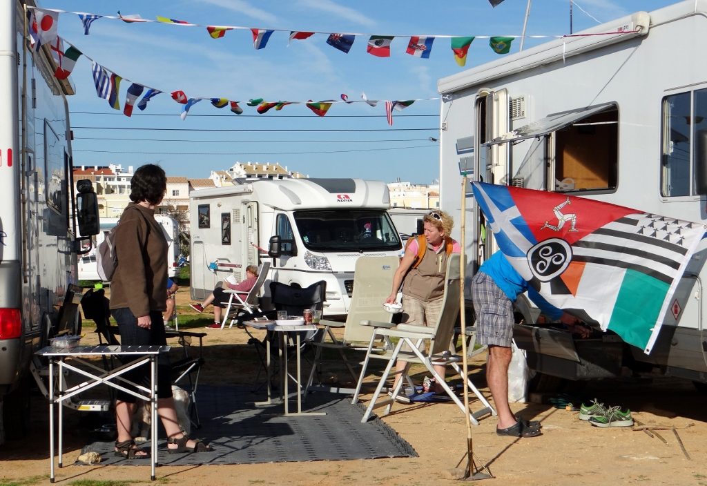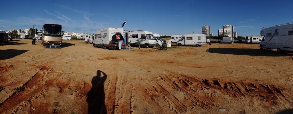 The aire here in Alvor’s been set up to accommodate a steady flood of motorhomes of all shapes and sizes. It has a good reputation, until the wind blows or the rain falls, then the sandstorm/mudbath conditions from the unsealed surface seem to generate some rather irate reviews. Bully for us, it’s dry and no rain’s forecast. No pitches are marked out, you just bagsie your space, and deploy whatever equipment you have at your disposal to expand and delimit your temporary domain.