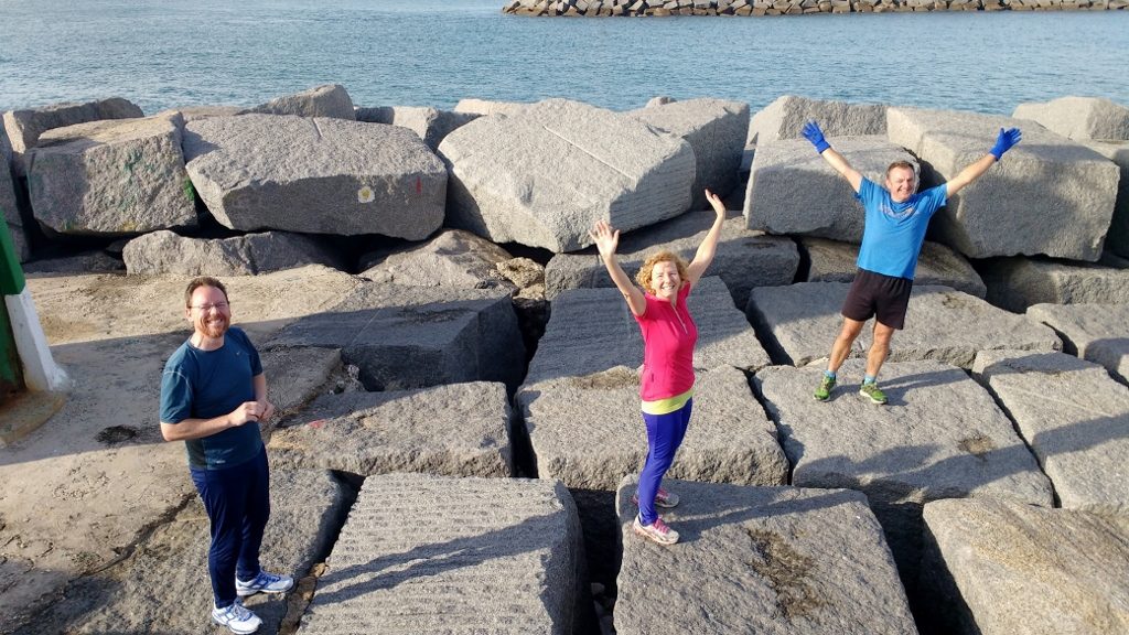The town feels a mix of tourist and traditional. We’ve had an amble about the cobbled streets, lined with white-washed houses, restaurants, shops, banks, bars, churches, car hire shops and estate agents. Weathered, bent locals sit quietly clutching bags on benches while tourists peer at menus printed in 4 languages. Outside the town a small port sits at the end of an estuary which leads out to the Atlantic. Wetlands, protected by elevated board walks play host to un-identified bods (as my Dad calls them, birds to you and me). Further out towards the sea fishermen stand chatting alongside poles lodged into the enormous rocks which protect the estuary entrance. We ran past the lot this morning.
