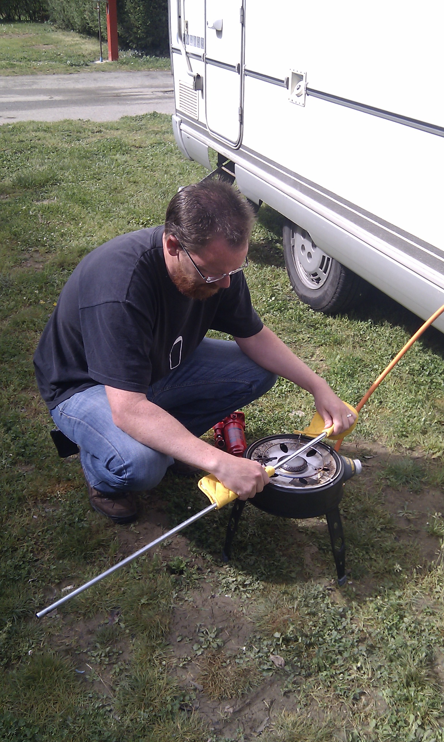 At the campsite I asked at reception if there was a place in town to buy the parts we need to fix Dave’s air ride suspension. She helpfully suggested a couple of places, but when I got back to Dave J was reading the messages we’d had through about bending the metal rod we’d bought to make the parts. So, out came our safari chef (not just a BBQ/oven for Dave, but now a furnace too!) and J turned into He-man. He heated up the rods and bent them into shape. We then discovered our hacksaw wasn’t up to the job, but I remembered seeing some plumbers vans fixing up one of the shower blocks, so we wandered over and helpfully (see I said they were a helpful lot) they were happy to let J use their vice and hacksaw – which was way superior to ours!