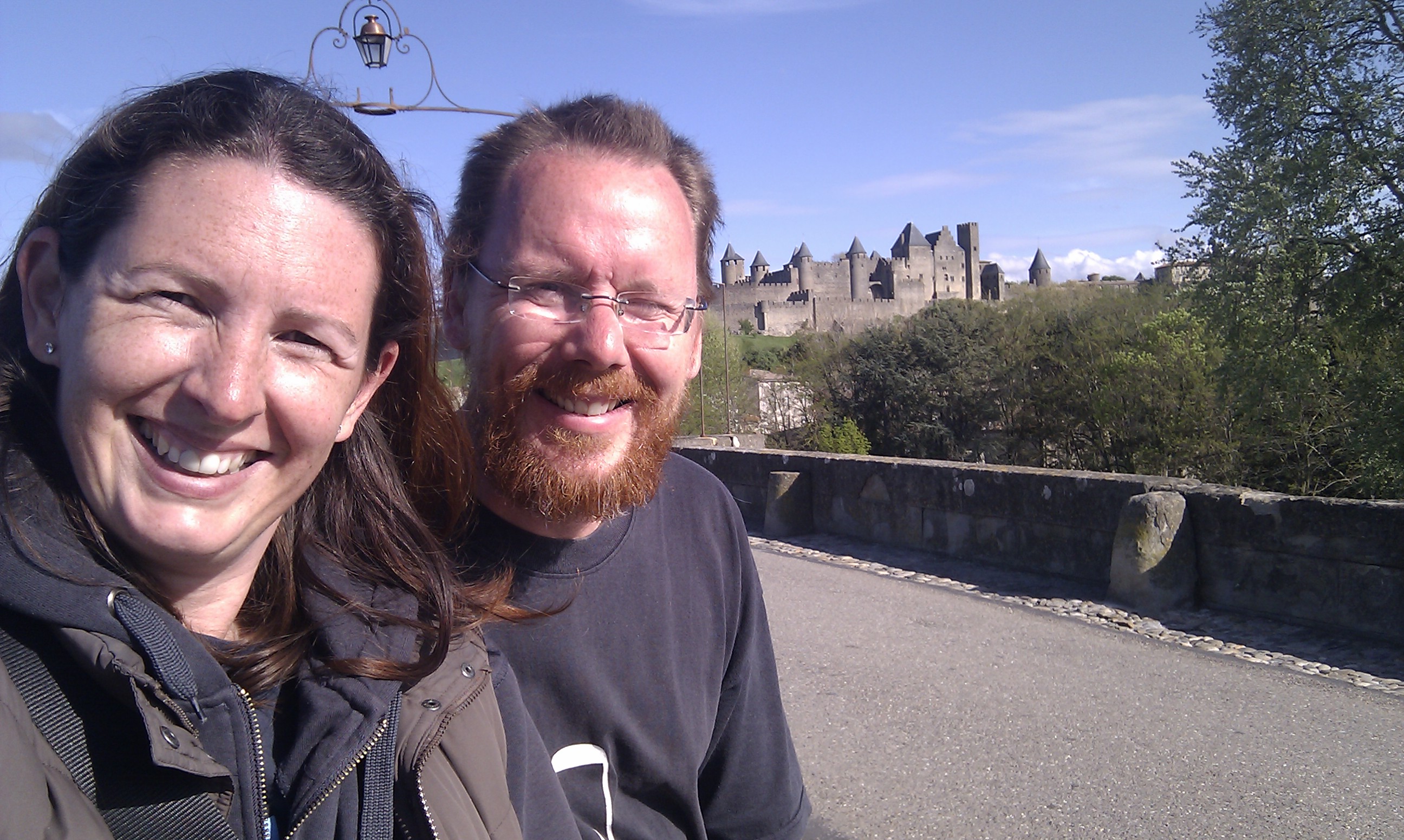 - Us squinting in the sun with Carcassonne old cite behind us.