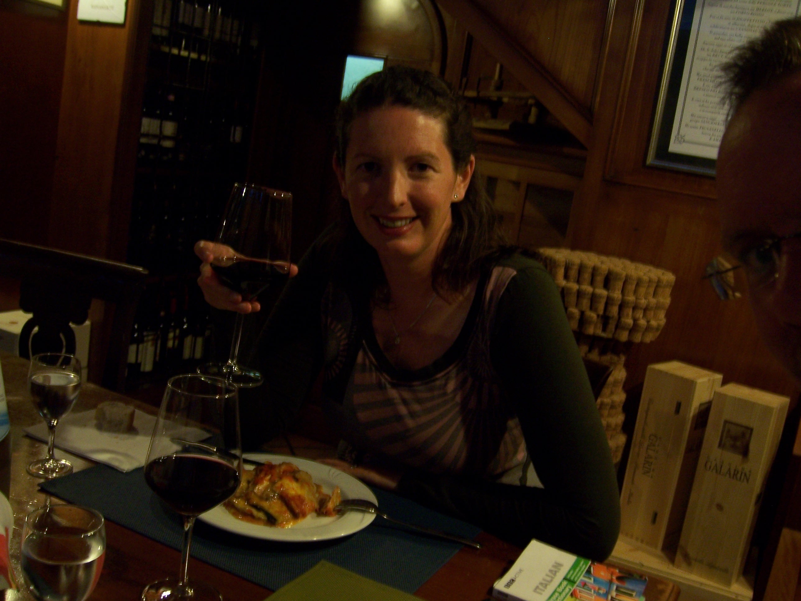 Since arriving in Italy, we’ve not had a single meal out in an effort to keep our budget on-track. We decided last night’s town of Belluno looked a good place to break the piggy bank open. An earlier foray into the town had revealed a rustic-looking place, clad with wood and with swings hanging from the archways out front. Sadly the swings were up when we arrived, but the outside seats were full of locals swishing tall wine glasses and elegantly sniffing away before taking a sip. No-one was eating but we asked inside if we could eat (actually I mimed putting food in my mouth, my Italian is that bad). Sure, come on in, and with that a local chap and his wine are evicted from the single table downstairs and we were installed.
