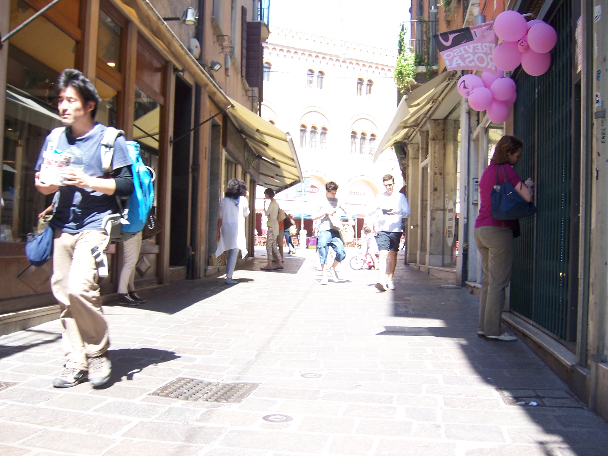 Treviso is, once you’re in the centre, a pretty place. As with all the Italian places we stay, it’s been here forever, at least a couple of thousand years. Many buildings have plaques announcing they were built in 1200, 1456, 1794 – bascially they’re old as the hills. Many more are new – Allied bombing in 1944 doing away with the need for many of these little plaques, and killing about 1000 people.The city stands in a rectangluar moat, formed by diverting a couple of rivers, and we watched a few people canoeing and rowing on it. A pretty cool way to spend a roasting hot afternoon.